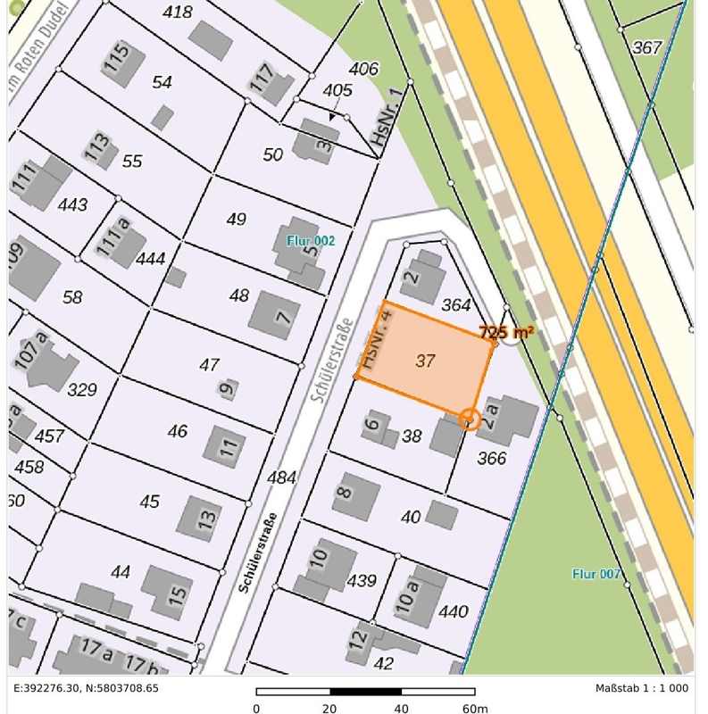 Damit ist der Bau einer Stadtvilla, eines 1,5 geschossigen Einfamilienhauses oder auch eines Bungalows denkbar. Das Grundstück kann mit einem Baukörper bebaut werden, wobei die Baulinie ca. 6 m entfernt von der Grundstücksgrenze zur Schülerstraße verlaufen würde.